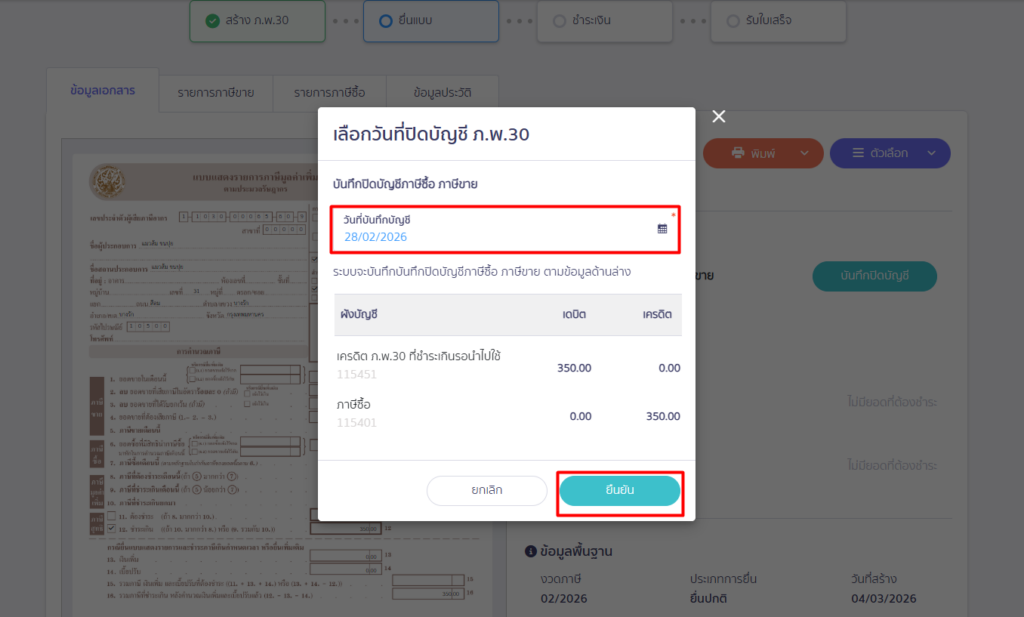เลือกวันที่ที่ต้องการบันทึกปิดบัญชี ภ.พ.30 > คลิกปุ่ม “ยืนยัน”